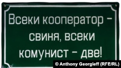„Всеки кооператор – свиня, всеки комунист – две!“ Надписът е върху метална табела, която е позната за някои от по-възрастните българи. Днес подобни останки се продават в антикварни магазини и са търсени за обзавеждане на заведения.