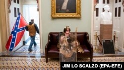 По информация на Бизнесинсайдър това е Джейк Анджели, който е един от лидерите на движението, свързано с конспиративната теория QAnon. Самият той е известен като “Q Shaman” – Q шаман, което обяснява и облеклото му, наподобяващо това на шаман. Сред проникналите в Капитолия бяха забелязани и други, носещи символи, свързани с QAnon. В конспирацията се твърди, че Тръмп се бори с представители на “дълбоката държава”, ръководена от Хилари Клинтън и други демократи, целящи да поробят хората и свързани със сатаната.