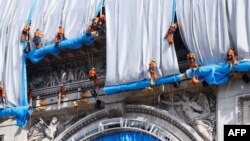 Малко след изгрев слънце в неделя първите работници са вече на върха на Триумфалната арка в Париж. Започват да се спускат по въжета надолу, облечени в оранжеви жилетки и каски. Развиват сребърно синия плат, който отразява сутрешната светлина.