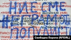 Двата транспаранта в центъра на София, които агитират с фалшивата новина, че COVID-19 е измислица и обявяват война на ваксините, са надраскани от граждани. Това видя репортер на Свободна Европа.
