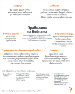 Международното хуманитарно право (МХП) предвижда защита на хора, които не участват или вече не участват във военни действия. Някои от правилата на МХП включват това да не бъдат нападани цивилни и медицински заведения например. Отговорните за тежки нарушения следва да бъдат издирвани, съдени или екстрадирани, например от Международния съд.