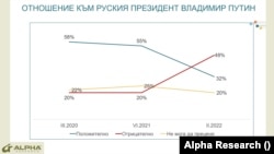 Отношението на българите към Владимир Путин и Русия се е променило рязко заради войната, която той води в Украйна. Това сочи проучване на „Алфа Рисърч“, направено за БНТ, което е направено на 4-тия ден от инвазията – 28 февруари сред 500 души от цялата страна.