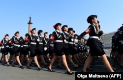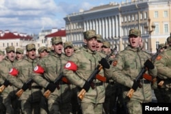 Тази снимка на военни кадети, които репетират в Санкт Петербург на 28 април за предстоящия военен парад на Русия, е едно от няколкото изображения, които се появиха в социалните медии наскоро като пример за приликата на лентите на ръцете с тези, носени от германските нацисти през 30-те и 40-те години на 20 век.