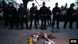 Хвърля ги Петър Сардарев, след като полицаите не разрешават куклите да бъдат оставени пред вратите на посолството - "както беше редно и както се прави по цял свят. Навсякъде посолствата са изписани и боядисани в червено", казва Сардарев.