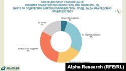 Коалицията между "Продължаваме промяната" и "Демократична България" (ПП-ДБ) би получила най-много гласове, ако изборите са днес, показва национално представително проучване на "Алфа Рисърч", публикувано в сряда. Преднината на ПП-ДБ пред коалицията ГЕРБ-СДС е само един процент, което показва паритет между двата основни конкурента за първото място. Двете коалиции имат в момента доверието съответно на 26,4 и 25,2 на сто от решилите да гласуват. Повечето избиратели не биха подкрепили коалиция между първите две политически сили, показва още изследването.