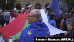 „Тук сме, първо защото вярваме в проевропейския път на България и второ защото смятаме, че наистина президентът прекалява, като твърде много се изказва политически в последните три години поне", каза Михаил, един от присъстващите на протеста, пред Свободна Европа. "Смятаме, че това е вредно за демокрацията в България и е вредно за цялото ѝ развитие“.