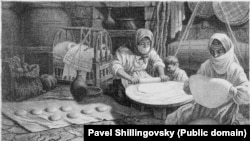 Арменски жени, който разточват тесто, за да го сложат да се пече на стените на традиционната в региона каменна фурна, наречена тонир, е една от десетките скици, направени от Шилинговски в Съветска Армения преди около 100 години.