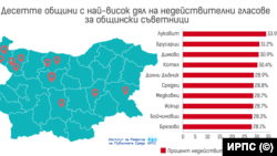 Сред първите десет общини с най-голям процент невалидни бюлетини са също Котел, Долни Дъбник, Средец, Медковец, Искър, Бойчиновци и Брезово. Делът невалидни бюлетини в тези общини също е близо една трета.