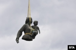 До вторник не се знаеше по какъв начин ще бъде свалена най-голямата фигура, тъй като тя е поставена на високо, масивна е и тежи тонове. Тогава бившият министър на културата Велислав Минеков каза пред Свободна Европа, че паметникът е лят на части, които са заварявани една по една, като е възможно да бъде нарязан и свален също на части, но това може да предизвика увреждания.