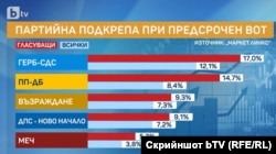 Трета към днешна дата е „Възраждане“ с 9,3% подкрепа, следвана от „ДПС-Ново начало“ с 9,1%.