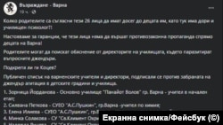 Споделеният от "Възраждане" - Варна списък съдържа 26 души от местни учебни заведения. Партийната организация настоява за "гаранции, че тези лица няма да вършат противозаконна пропаганда спрямо децата". Освен това призовава родители да поискат обяснения от директорите на учебните заведения, "където паразитират въпросните джендъри".