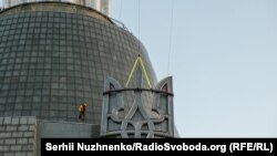Емблемата на Украйна - тризъбецът от нейния герб - беше поставена на една от най-разпознаваемите забележителности в столицата Киев - паметника "Родина майка", на мястото на символа на СССР - сърп и чук, съобщи УНИАН.
